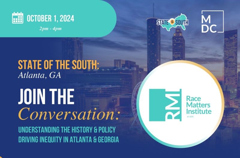 | Race Matters Institute at State of the South: Atlanta Join us for a participatory exercise with MDC’s Race Matters Institute to understand the history of events, policies, and lived experiences in Atlanta and consider how they have amplified inequity. We will examine current equity indicator data prepared by Georgia Policy Labs to highlight key issue areas. Read More → |